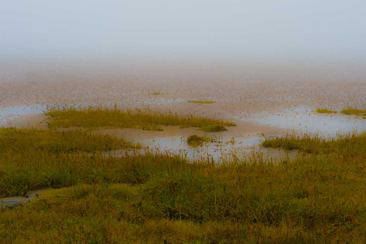 Wer zu dieser Jahreszeit einen Ausflug auf die Insel Lindisfarne an der Küste Northumberlands machen will, muss dies zu Fuss unternehmen, denn Busse verkehren in der Nebensaison keine mehr. Da die Strasse vom Festland nur während Ebbe befahren oder begangen werden kann, ist vorgängig der Tide-Kalender zu konsultieren. Es war zwar Anfangs November noch warm, aber schon sehr neblig. Das verlieh der doch eher kargen Szenerie auf dem kilometerlangen Spaziergang eine beinahe schon monochrome Anmutung. Für den Rückweg gönnte ich mir dann aber doch ein Taxi…